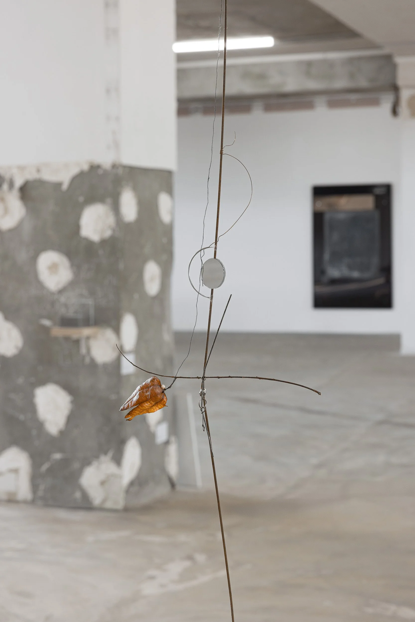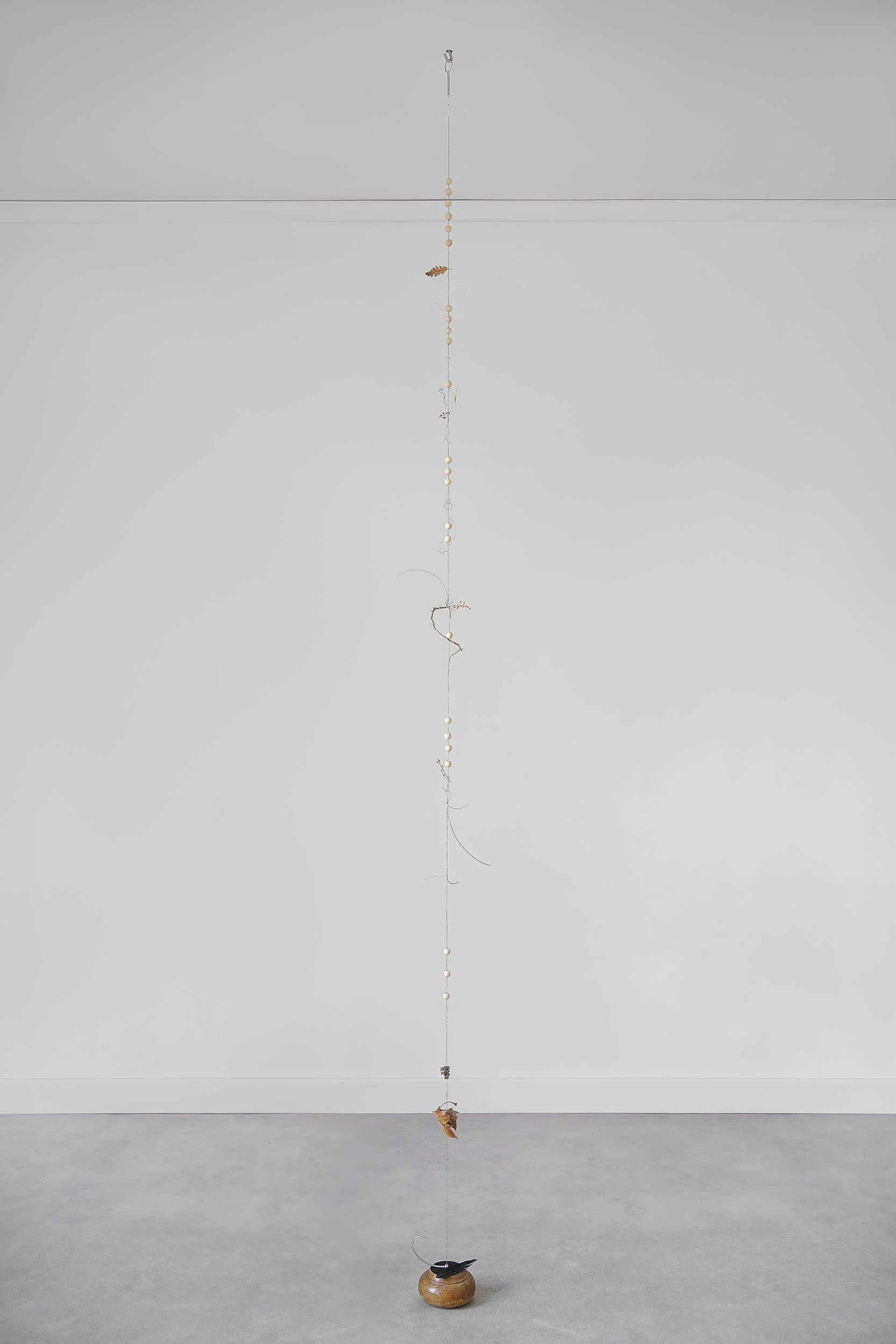 These two sculptural essays are related to the story of talented pianist and novelist Pavel Kushnir, who was arrested for an antiauthoritarian video blog and died in obscurity in jail during his hunger strike in the summer of 2024. The axis bears traces of everyday life and turns the things carefully selected into abstract biographical fragments with socio-political context. The strings that lost their piano are a political tongue that lost its voice. The lifespan of memory is uncertain, but the sculptural axis becomes a poetic storage of quasi-archeological findings from a barely visible timeline for the lost things and their voices.